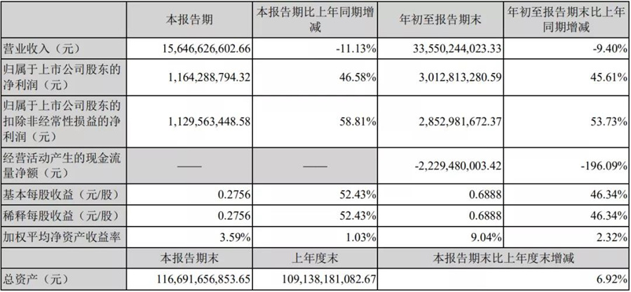 第三季度公司實現(xiàn)營業(yè)收入約156.47億元,同比下降11.13%。實現(xiàn)歸屬于上市公司股東的凈利潤約11.64億元,同比增長46.58%。實現(xiàn)基本每股收益0.2756元,同比增長52.43%。