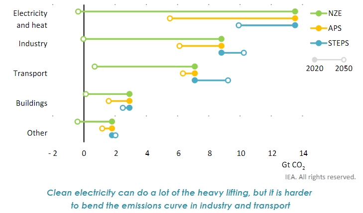 IEA的報告要表述的意向非常清晰:實現(xiàn)“2050年凈零排放方案”有很大的困難,但綜合、整體利益巨大;在技術(shù)方面,即使眼前有最具競爭力的發(fā)電技術(shù),也要堅決限制落后產(chǎn)能的高耗能項目。