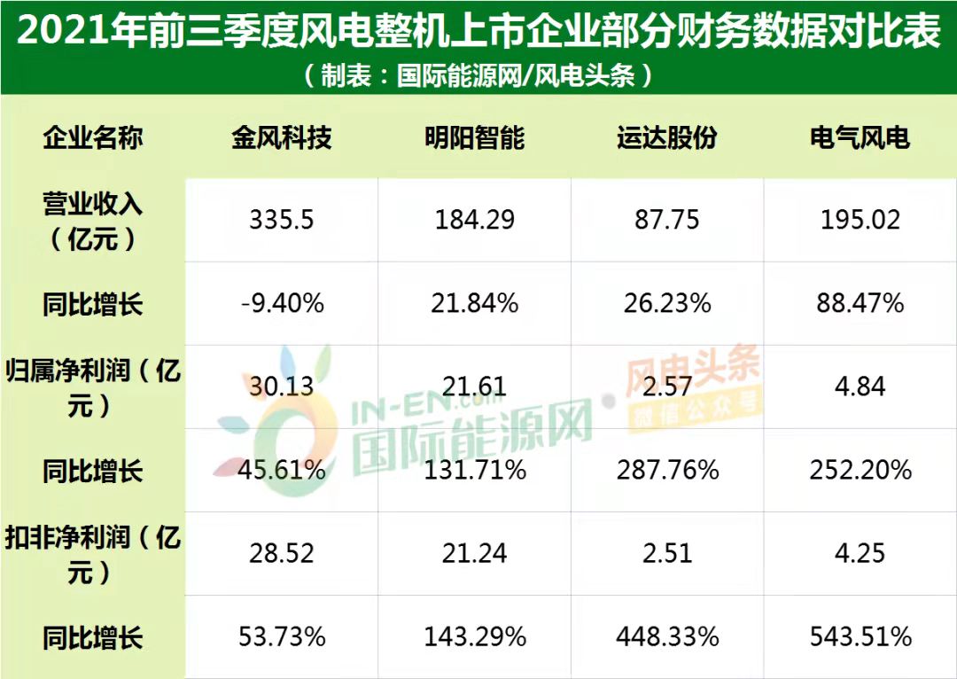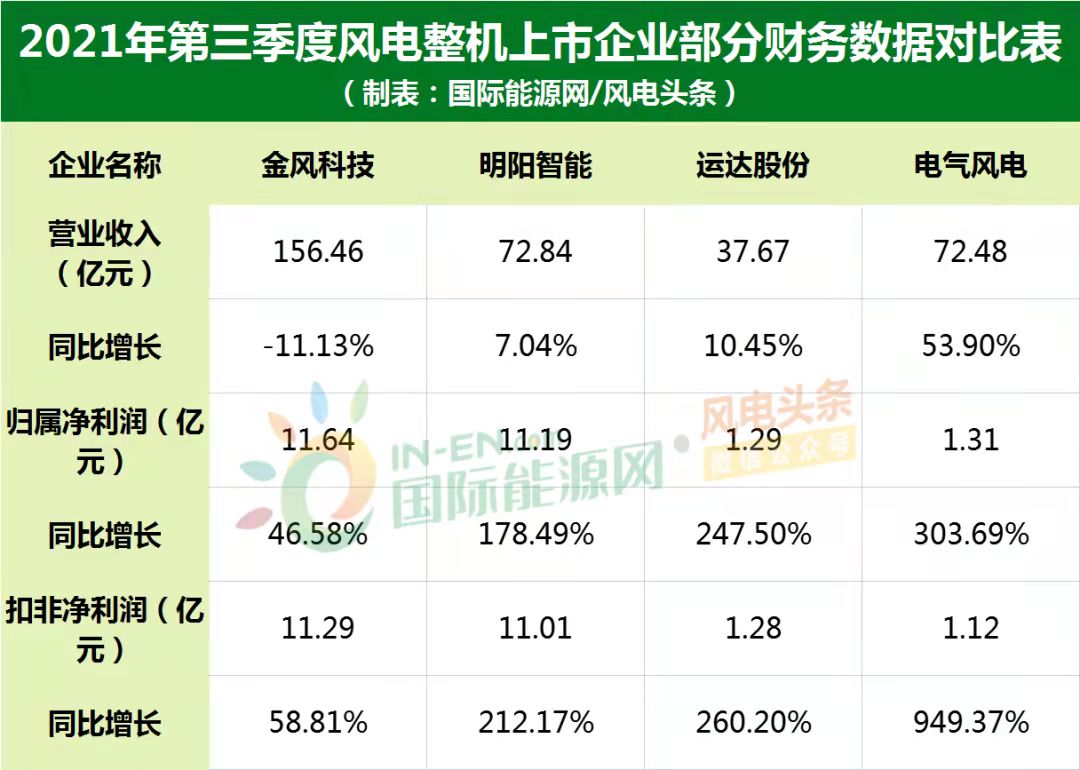 第三季度中,營業(yè)收入排名為金風(fēng)科技、明陽智能、電氣風(fēng)電、運(yùn)達(dá)股份;扣非凈利潤排名為金風(fēng)科技、明陽智能、運(yùn)達(dá)股份、電氣風(fēng)電。