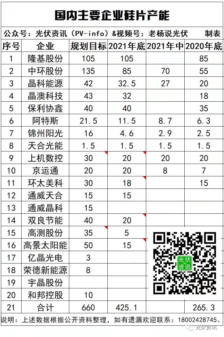 以下是2020年底、2021年國內(nèi)主要企業(yè)硅片產(chǎn)能數(shù)據(jù)一覽: