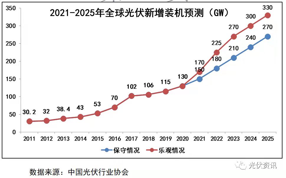 而根據(jù)光伏協(xié)會(huì)的預(yù)測(cè),2022年全球裝機(jī)容量180-225GW。