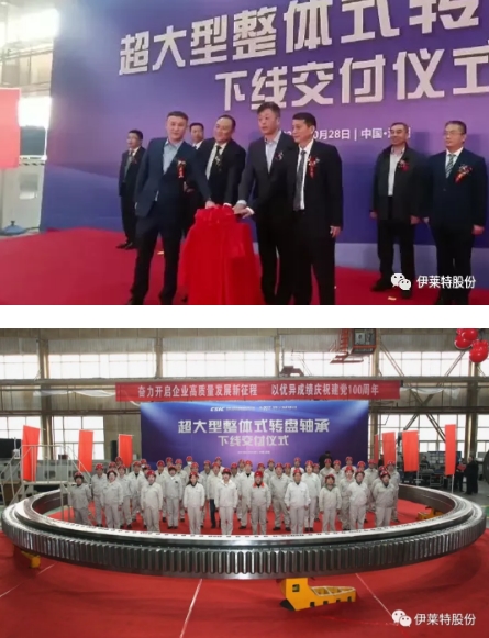 2021年10月28日,直徑11.5米的整體式轉(zhuǎn)盤軸承在洛軸下線,伊萊特股份董事長、總裁牛余剛,執(zhí)行總裁曹緒忠受邀參加產(chǎn)品下線儀式。該軸承的順利下線標志著我國超大型整體式軸承的制造能力達到國際先進水平。