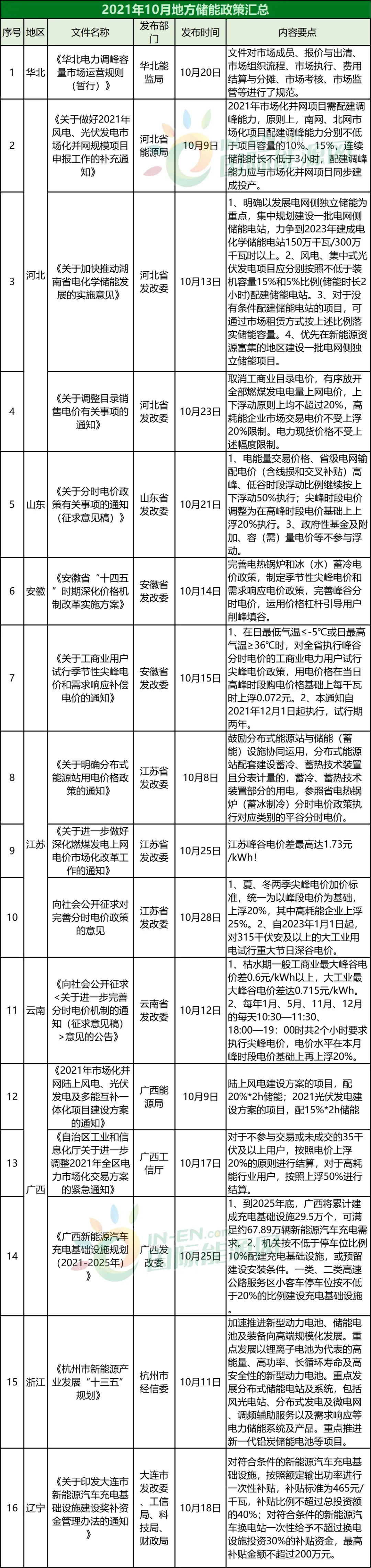 今年以來部委發(fā)布的儲能相關文件中,多數(shù)是有關新能源配置儲能、對電價的相關規(guī)定、儲能參與輔助服務等。在10月份,有一新情況出現(xiàn),那就是9月開始在多地發(fā)生的缺電引發(fā)了一系列有關煤電和電價的政策出臺,而這些政策都將對儲能領域產生很大的影響。