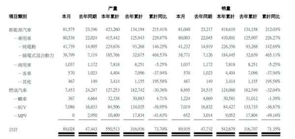 比亞迪汽車10月全系銷售89935輛,同比增長(zhǎng)88.42%;其中,新能源汽車銷量為81040輛,同比增長(zhǎng)249%;燃油汽車銷量?jī)H為8895輛,占總銷量比例不足一成。