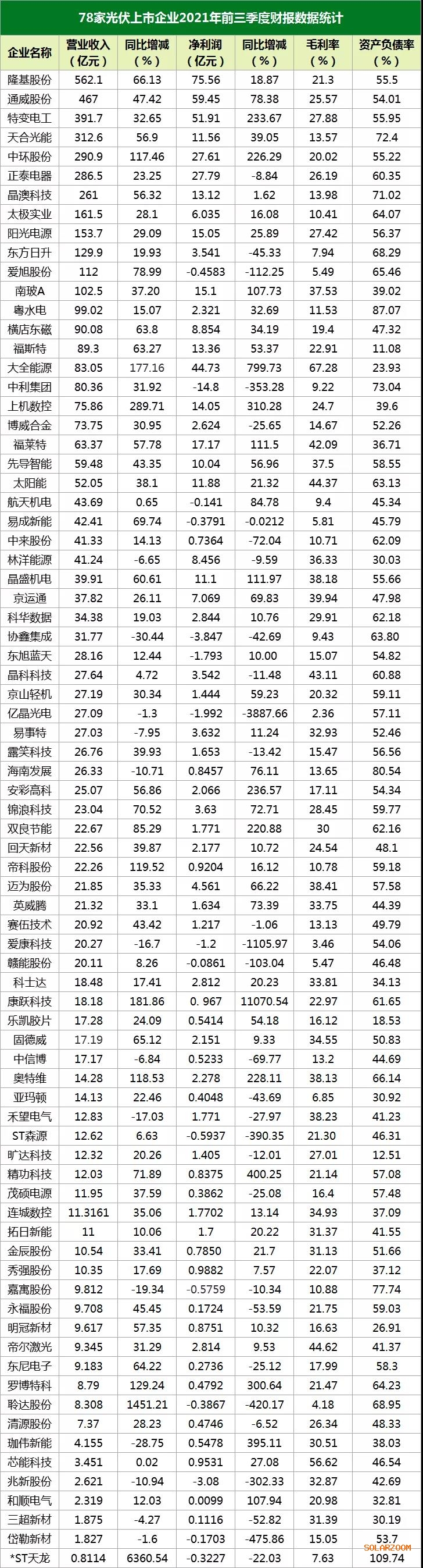 據(jù)國際能源網(wǎng)/光伏頭條不完全統(tǒng)計,光伏電池/組件供應(yīng)商、逆變器供應(yīng)商、光伏支架供應(yīng)商、光伏設(shè)備制造商、光伏電站投資商、光伏材料供應(yīng)商等共計78家企業(yè)披露了2021年前三季度業(yè)績報告。