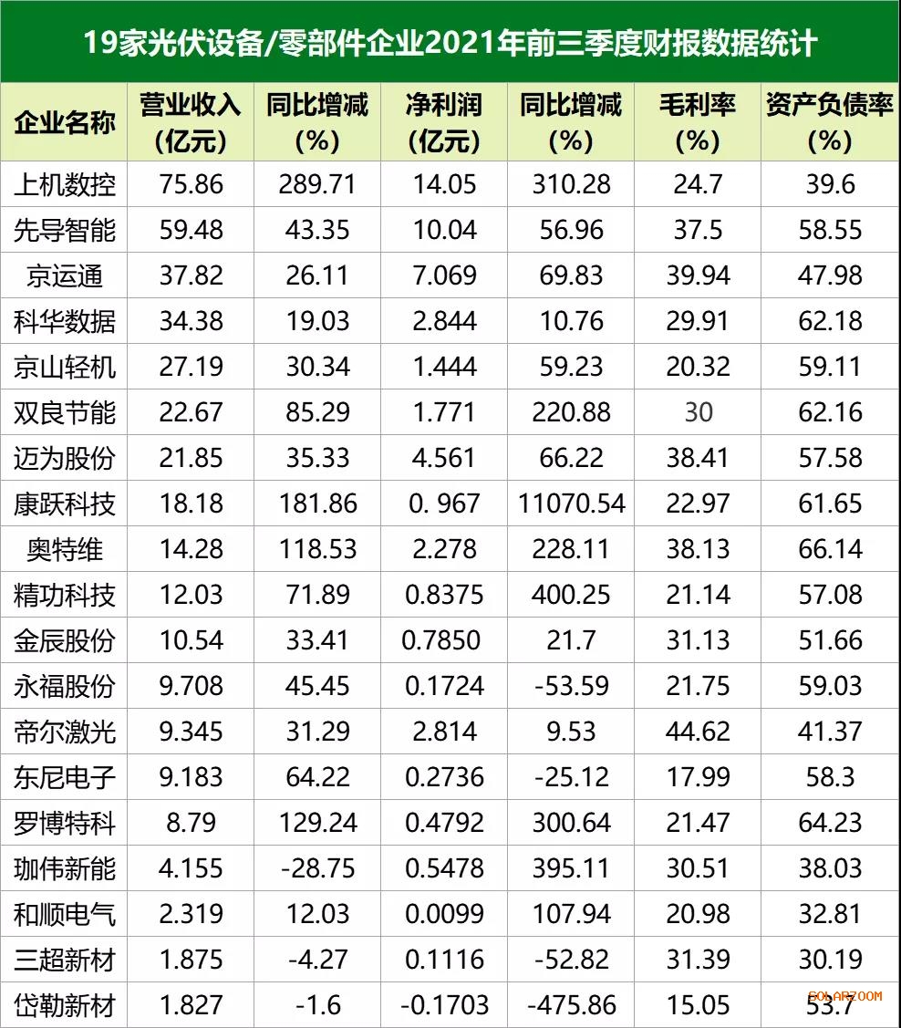 國際能源網(wǎng)/光伏頭條梳理,光伏設(shè)備/零部件制造商共有19家企業(yè)公布業(yè)績,分別是上機數(shù)控、先導(dǎo)智能、京運通、科華數(shù)據(jù)、京山輕機、雙良節(jié)能、邁為股份、康躍科技、奧特維、精功科技、金辰股份、永福股份、帝爾激光、東尼電子、羅博特科、珈偉新能、和順電氣、三超新材、岱勒新材。