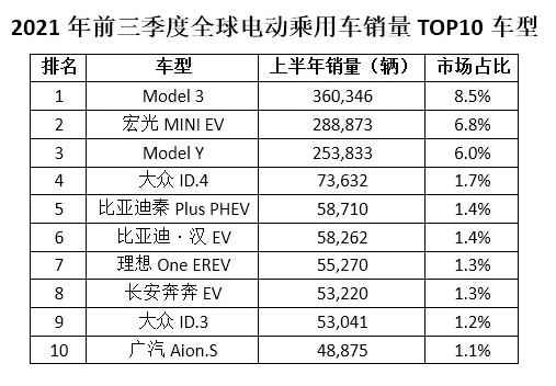 據電池中國統計,今年前三季度,全球最為暢銷的TOP10電動汽車,累計總銷量超過130萬輛,占全球電動汽車銷量約30%。今年前三季度全球最暢銷的TOP10電動乘用車分別為特斯拉Model 3、五菱宏光MINI EV、特斯拉Model Y、大眾ID.4、比亞迪·秦Plus PHEV、比亞迪·漢EV、理想One EREV、長安奔奔EV、大眾ID.3、廣汽Aion.S。