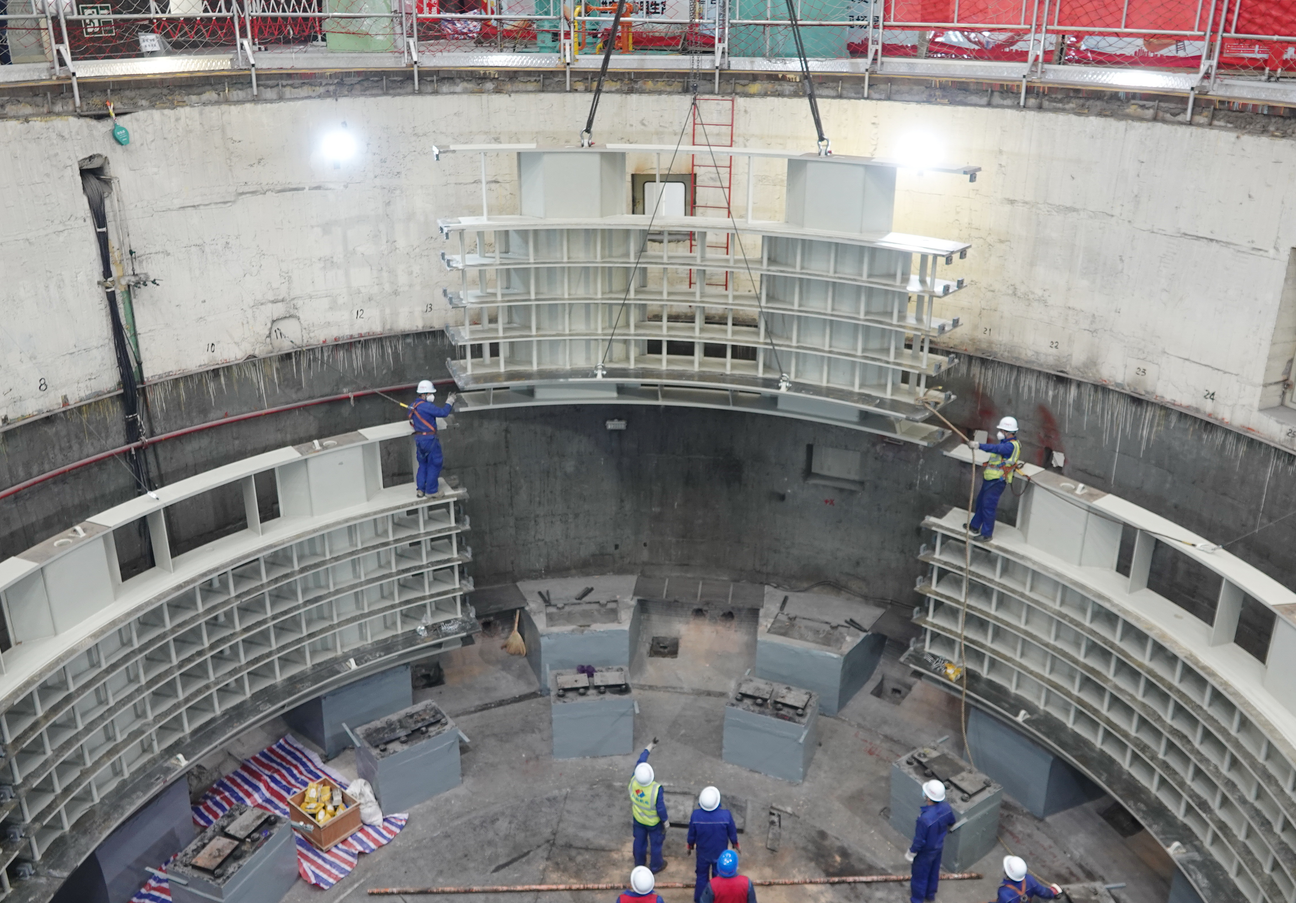 由于定子機(jī)座尺寸較大、重量大,被分成6瓣運(yùn)抵現(xiàn)場(chǎng)進(jìn)行組圓和合縫焊接,其中每瓣重達(dá)19噸,焊接工作量大、質(zhì)量要求高,組拼后下環(huán)板上表面與機(jī)組軸線垂直度需要控制在2毫米內(nèi)。為確保此項(xiàng)工作圓滿完成,起吊前,該廠對(duì)起吊方案進(jìn)行了詳細(xì)審查,論證方案的可行性和可操作性,細(xì)化部署準(zhǔn)備工作,備齊備足現(xiàn)場(chǎng)防護(hù)材料,包括木方、千斤頂?shù)劝才诺轿?,多輪次?shí)地確認(rèn)吊點(diǎn)、起吊路徑,安排人員全程配合。