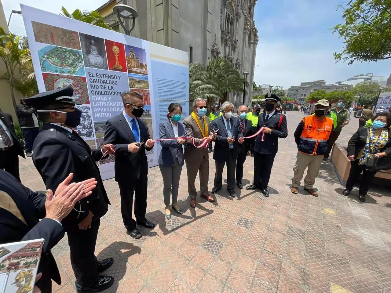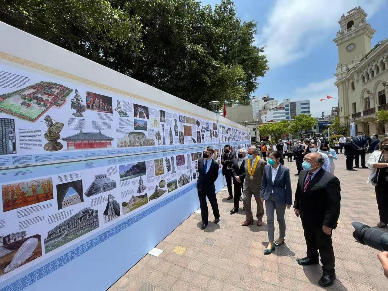 2021年11月4日,由中國長江三峽集團(tuán)有限公司、秘中文化中心、《今日中國》雜志聯(lián)合主辦的《文明的長河——中拉文明互鑒》展再次回到秘魯首都利馬,在Miraflores 市政廣場前開幕,并舉行了剪彩儀式。秘中文化中心主席陳路、副主席戴國威、今日中國雜志秘魯代表處負(fù)責(zé)人孟可心、秘魯前衛(wèi)生部長楊莫塔等出席了剪彩儀式。