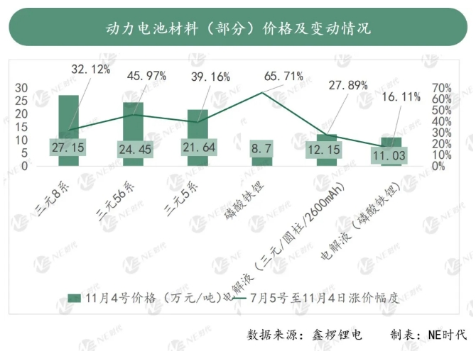 今年原材料價格普遍上漲,各體系正極材料從7月初開始到11月4號,漲價幅度基本上在40%左右,電解液也出現(xiàn)了一定幅度的上漲,磷酸鐵鋰材料漲價幅度高達65.71%,但是單價與三元正極材料相比優(yōu)勢依舊十分明顯。