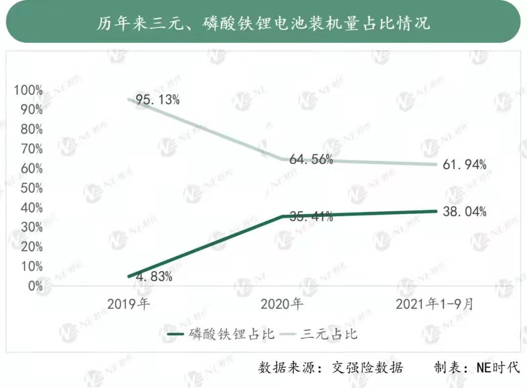 以乘用車市場為例,磷酸鐵鋰裝機量占比從2019年4.83%到2020年35.41%,再到今年前9個月38.04%,從這個拐點也能看出來疫情導致的原材料價格上漲是市場換用磷酸鐵鋰一個很大的因素。但是,今年磷酸鐵鋰電池裝機量與去年相比,已經(jīng)趨于平穩(wěn)了,從趨勢上來看應(yīng)該很難有爆發(fā)性地增長。