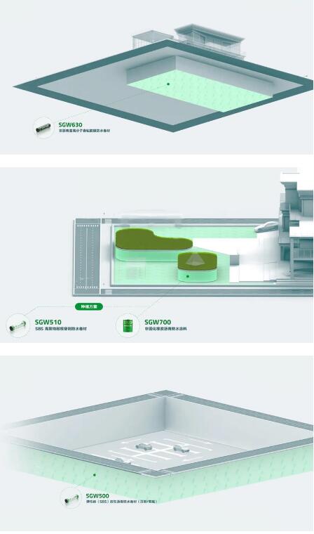 地下空間防水工程為隱蔽工程,作為城市建筑大型化,高層化與充分利用地下空間的結(jié)果,其防水工程質(zhì)量與建筑物整體結(jié)構(gòu)安全,延長使用壽命有直接關(guān)系。該項目中,為降低地下空間建成后出現(xiàn)防水失效、滲漏水等情況出現(xiàn),三棵樹防水以SGW630非瀝青基高分子自粘膠膜防水卷材為建筑地下室底板筑起牢固的附加防水層;側(cè)墻使用SGW500彈性體(SBS)改性瀝青防水卷材;頂板采用SGW700非固化橡膠瀝青防水涂料與SGW510高聚物耐根穿刺瀝青防水卷材兩種同為瀝青基材質(zhì)材料令防水層一次成型,實現(xiàn)基層滿粘。全方位保護項目地下空間免受滲漏水煩惱。