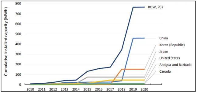 2010-2020年全球液流電池裝機(jī)量增長(zhǎng)情況(MWh)