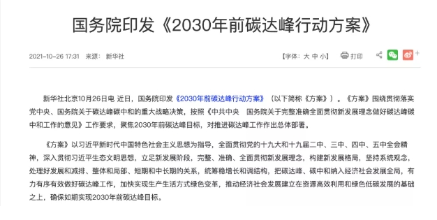 10月24日,國務(wù)院印發(fā)《2030年前碳達(dá)峰行動方案》(以下簡稱《方案》)。