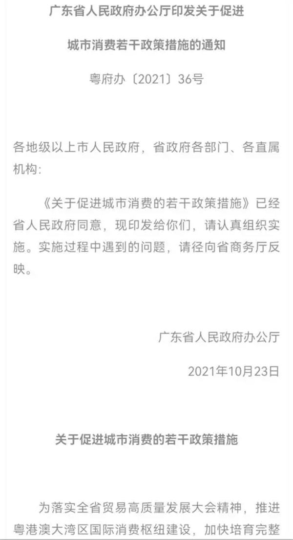 日前,廣東省人民政府官網(wǎng)發(fā)布《廣東省人民政府辦公廳印發(fā)關(guān)于促進城市消費若干政策措施的通知》(以下簡稱《通知》)。