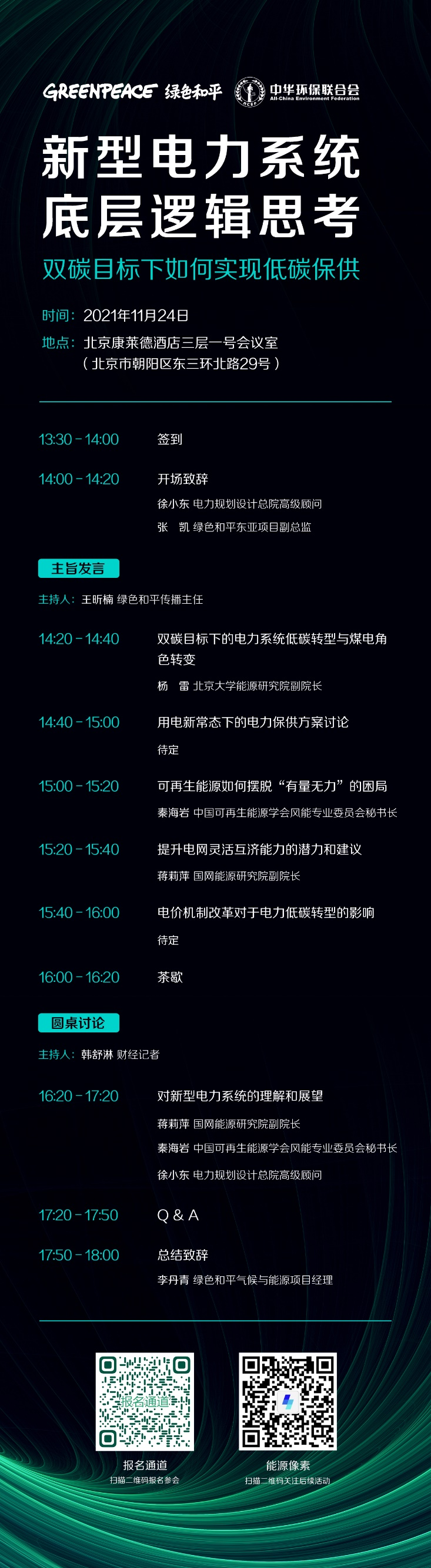 為積極推進“雙碳”目標在中國能源電力領(lǐng)域的落實,綠色和平與中華環(huán)保聯(lián)合會合作的“國內(nèi)低碳發(fā)展政策研究”項目將于11月24聯(lián)合舉辦線下研討會《新型電力系統(tǒng)底層邏輯思考——雙碳目標下如何實現(xiàn)低碳保供》,旨在從低碳保供的角度,思考當下構(gòu)建新型電力系統(tǒng)中的困境,并從可再生能源的高比例發(fā)展出發(fā),探討促進新型電力系統(tǒng)穩(wěn)定、健康發(fā)展的解決方案。