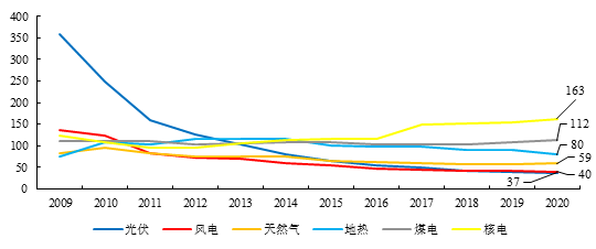 圖1:全球各類能源大型電站LCOE對比(美元/MWh)