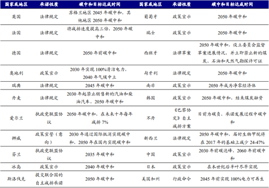 從全球氣候角度看,由二氧化碳等溫室氣體排放引起的全球氣候變化已經(jīng)成為全人類需要面對的重大挑戰(zhàn)之一,實現(xiàn)碳達峰、碳中和目標已形成全球共識,減碳趨勢不可阻擋。根據(jù)不完全統(tǒng)計,截至2020年底全球已經(jīng)有44個國家和經(jīng)濟體正式宣布了碳中和目標,包括已經(jīng)實現(xiàn)目標、已寫入政策文件、提出或完成立法程序的國家和地區(qū)。