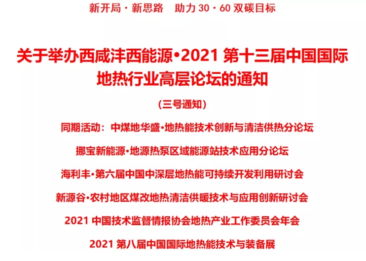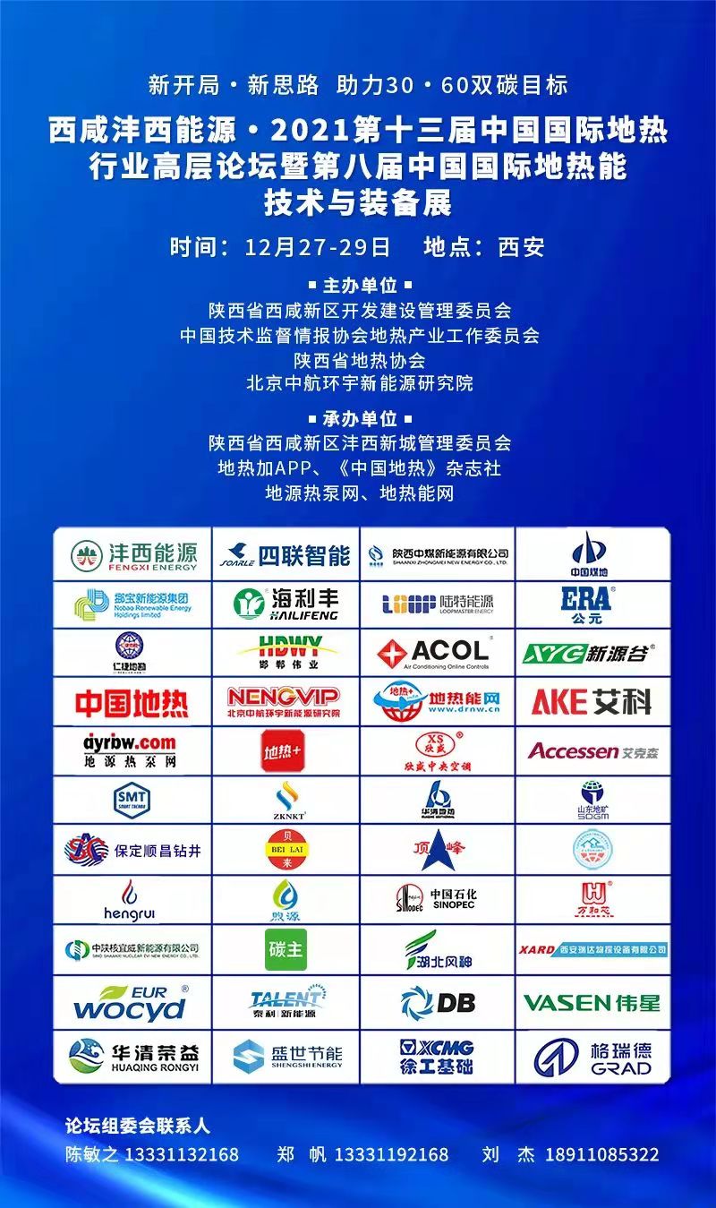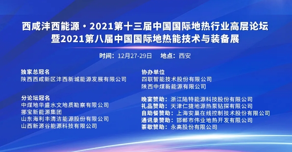 加快實(shí)施和推進(jìn)地?zé)崮艿惹鍧嵱媚芴娲?,?yōu)化能源結(jié)構(gòu),對于構(gòu)建清潔低碳、安全高效的能源體系以及助力中國實(shí)現(xiàn)2030碳達(dá)峰、2060碳中和雙碳目標(biāo)具有重要的意義。中國國際地?zé)嵝袠I(yè)高層論壇(原中國國際地源熱泵行業(yè)高層論壇)自2009年創(chuàng)辦至今,已連續(xù)成功舉辦了十二屆,現(xiàn)已成為地?zé)犷I(lǐng)域規(guī)模最大、規(guī)格最高、影響最廣的行業(yè)盛會。經(jīng)研究決定,組委會于2021年12月27-29日在西安召開西咸灃西能源·2021第十三屆中國國際地?zé)嵝袠I(yè)高層論壇,同期還將舉辦多場專題會議及活動。具體相關(guān)內(nèi)容如下: