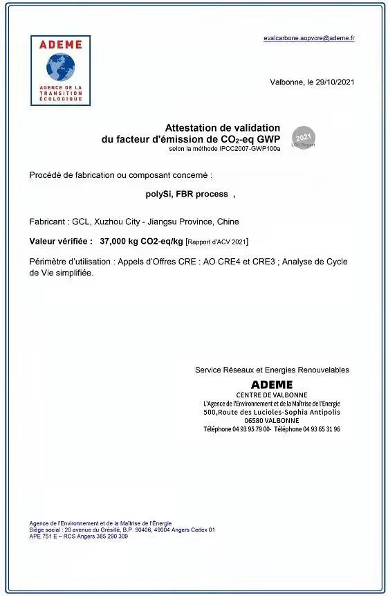 10月27日,保利協(xié)鑫在取得中國第一張顆粒硅碳足跡認(rèn)證證書的基礎(chǔ)上,又拿到了由法國環(huán)境與能源控制署頒發(fā)的《GCL顆粒硅產(chǎn)品碳足跡證書》,證明該公司每生產(chǎn)1千克顆粒硅的碳足跡數(shù)值為37.000千克二氧化碳當(dāng)量,大大刷新了此前由德國瓦克公司創(chuàng)造的全球“最低”——每功能單位57.559千克二氧化碳當(dāng)量紀(jì)錄。