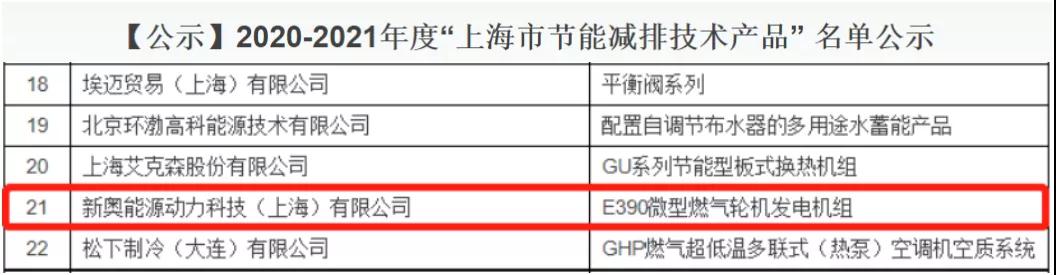 為加快節(jié)能減排技術(shù)產(chǎn)品推廣應(yīng)用,助力“雙碳”工作,受上海市經(jīng)濟(jì)和信息化委員會(huì)委托,上海市能效中心(上海市產(chǎn)業(yè)綠色發(fā)展促進(jìn)中心)組織開(kāi)展2020-2021年度“上海市節(jié)能減排技術(shù)產(chǎn)品”申報(bào)和評(píng)審工作。官方已于9月份發(fā)布公示名單,新奧動(dòng)力E390微型燃?xì)廨啓C(jī)發(fā)電機(jī)組榮耀上榜!