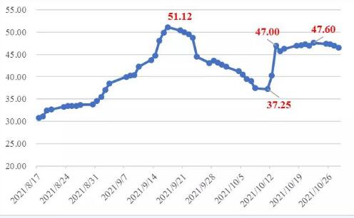 今年以來,天然鈾現貨價格從8月的30.75美元/磅上漲至9月的51.12美元/磅(達到2012年7月以來的最高水平),漲幅達65%。隨后逐步下跌,10月11日跌至37.25美元,已接近上漲前水平。10月12日與13日,僅兩天時間鈾價再次沖高,達到47美元/磅,近半個月經歷小幅波動,目前仍維持47美元/磅左右。