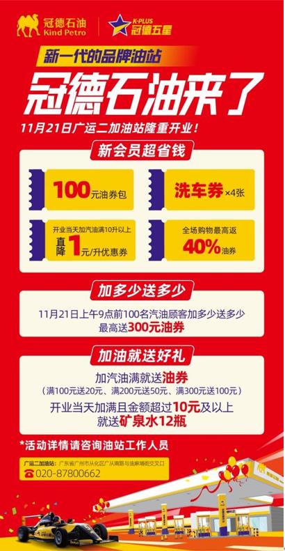 一直以來,“冠德石油何時再開新站”這個話題在車主圈中討論度極高,近日終于傳來喜訊。11月21日廣運(yùn)二加油站在廣州盛大開業(yè),地址位于廣州市從化區(qū)廣從南路與油麻埔街交叉口,北回歸線附近,新一代的品牌油站創(chuàng)新基因強(qiáng)勢注入廣東省會,給廣州及周邊車主帶去更高品質(zhì)的燃油和優(yōu)質(zhì)卓越服務(wù),助力廣州車主的出行生活更美好。