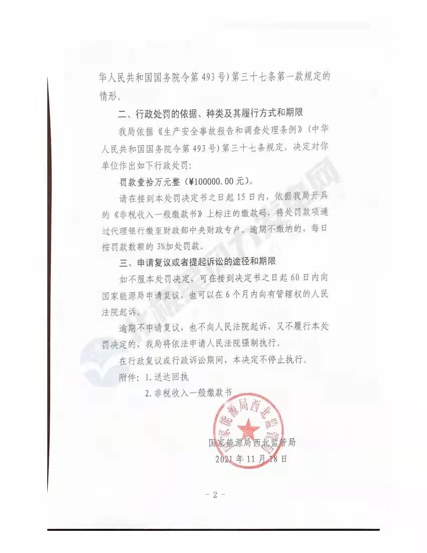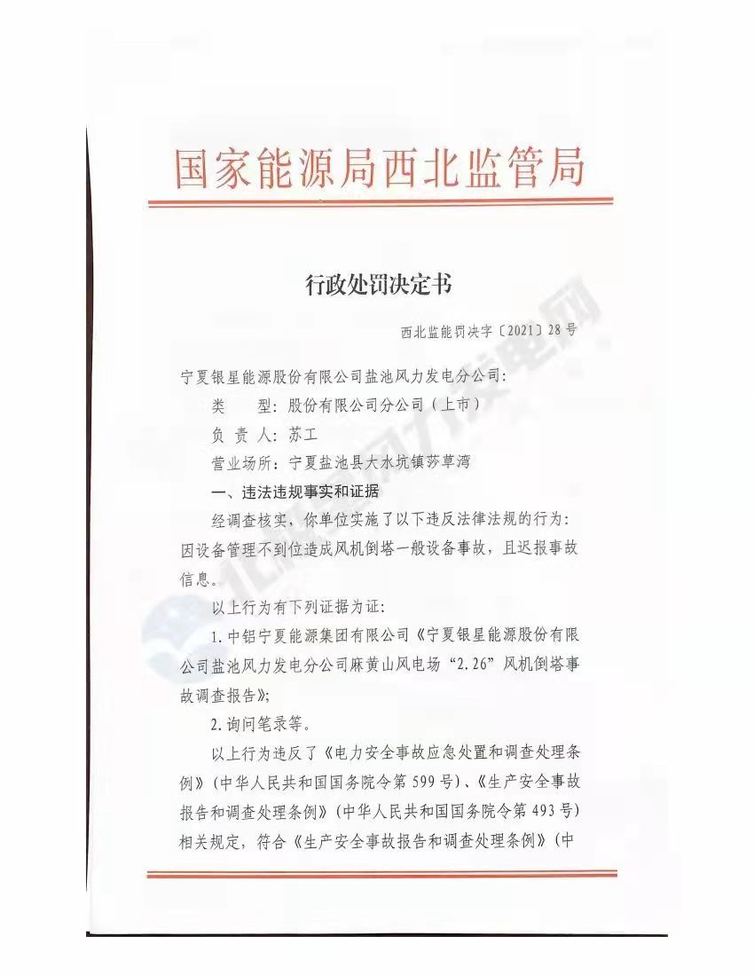 近日,國(guó)家能源局西北監(jiān)管局發(fā)布【2021】28號(hào)行政處罰決定書,因設(shè)備管理不到位造成風(fēng)機(jī)倒塔一般設(shè)備事故,且遲報(bào)事故信息,對(duì)寧夏銀星能源股份有限公司鹽池風(fēng)力發(fā)電分公司罰款10萬(wàn)元。