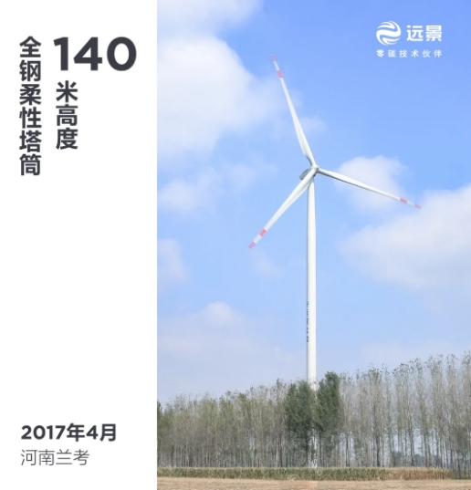 2017年4月,遠景能源140米高度全鋼柔性塔筒EN-121/2.2MW風(fēng)機吊裝創(chuàng)下了最高塔筒140米、最高風(fēng)機200.5米的中國紀錄。