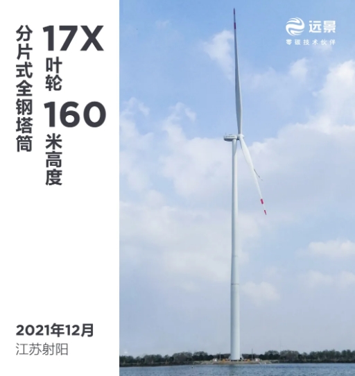 2021年12月5日,全球首個17x級別風(fēng)輪、160米大直徑分片式全鋼塔筒智能風(fēng)機在遠景能源江蘇射陽智慧陸上風(fēng)場吊裝完成,這是目前全球分片塔筒的最大風(fēng)輪風(fēng)機。