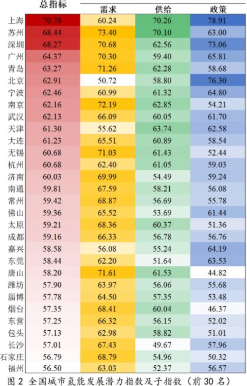 《氫能城市發(fā)展?jié)摿ε判邪瘛氛n題報告基于需求、供給和政策三個維度構(gòu)建綜合評價體系,對我國285個城市的氫能發(fā)展?jié)摿M行了研究。研究發(fā)現(xiàn),全國氫能發(fā)展?jié)摿ε琶?0名的城市依次為上海、蘇州、深圳、廣州、青島、北京、寧波、南京、武漢、天津,第11名至30名的城市包括大連、無錫、杭州、濟南、南通、常州等城市。