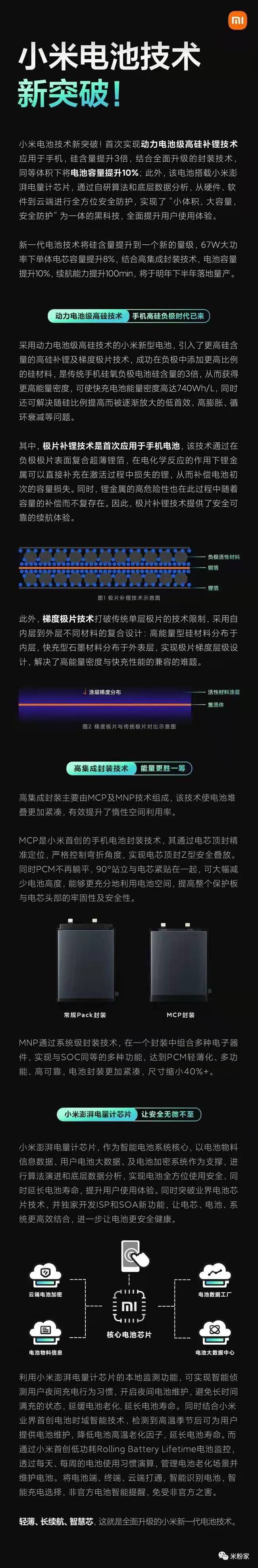 小米官方宣稱,新一代電池技術(shù)實(shí)現(xiàn)動(dòng)力電池級(jí)高硅補(bǔ)鋰技術(shù)應(yīng)用于手機(jī),負(fù)極硅含量提升3倍,結(jié)合全面升級(jí)的封裝技術(shù),同等體積下將電池容量提升10%,續(xù)航能力提升100min。