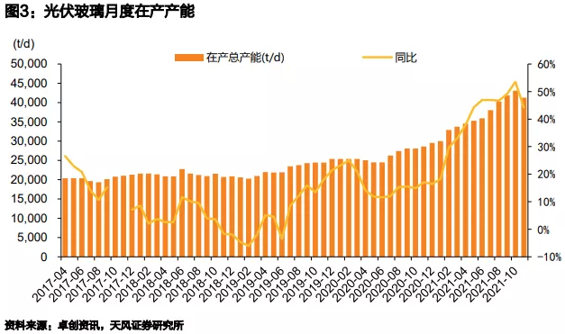 根據(jù)卓創(chuàng)資訊的統(tǒng)計,2021年初超白壓延在產(chǎn)產(chǎn)能29540t/d,至今達到41260t/d,凈增量達 11720t/d,Q4產(chǎn)能或持續(xù)增加。3月后光伏玻璃價格出現(xiàn)大幅下行,疊加“雙碳”背景下地方政 府能耗指標或有收緊趨向,當前不能排除后續(xù)產(chǎn)線延期投產(chǎn)可能,據(jù)卓創(chuàng)資訊,目前行業(yè)內(nèi)少數(shù) 產(chǎn)線的點火計劃延期。