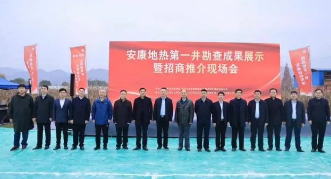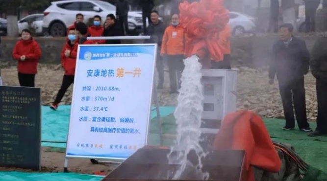 2021年12月14日,陜西省安康市第一口地?zé)峋诤憧谑痉秴^(qū)高儉村出水,井深2010.88m,井口水溫37.4℃,24小時(shí)穩(wěn)定流量370m/d。這是安康市礦產(chǎn)資源開發(fā)的重大喜訊和重大突破。安康市自然資源局和恒口示范區(qū)管委會(huì)聯(lián)合舉行勘查成果發(fā)布會(huì)。
