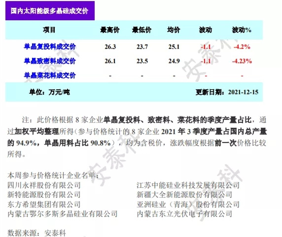 本周硅料大部分按約定的長單出貨,市場交易體現(xiàn)少量現(xiàn)貨采購,市場仍處于博弈階段。從硅料環(huán)節(jié)供應來看,預測12月份國內(nèi)供應量在4.5萬噸,環(huán)比增加3000噸左右。由于超過4萬噸的產(chǎn)量執(zhí)行月度交貨的長單,上下游博弈集中在長單之外的另星采購交易。硅料企業(yè)庫存雖有一定增加,但是行業(yè)平均水平也僅為7-10天。