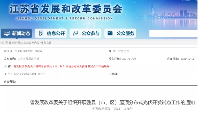 江蘇省發(fā)展改革委關(guān)于組織開展整縣(市、區(qū))屋頂分布式光伏開發(fā)試點(diǎn)工作的通知