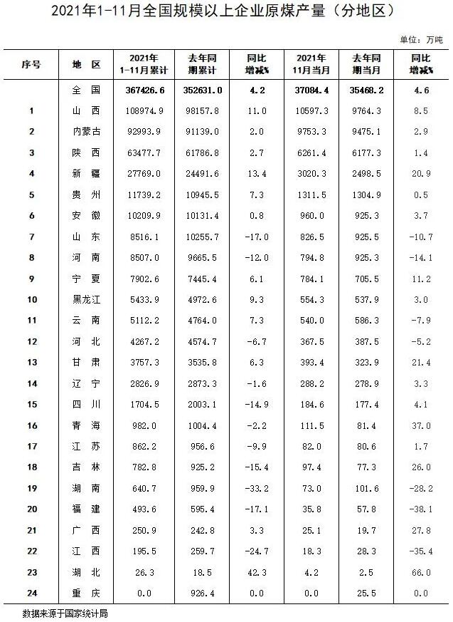 國家統(tǒng)計(jì)局?jǐn)?shù)據(jù)顯示,2021年11月全國規(guī)模以上企業(yè)原煤產(chǎn)量37084.4萬噸,同比增長4.6%;1—11月累計(jì)產(chǎn)量367426.6萬噸,同比增長4.2%。