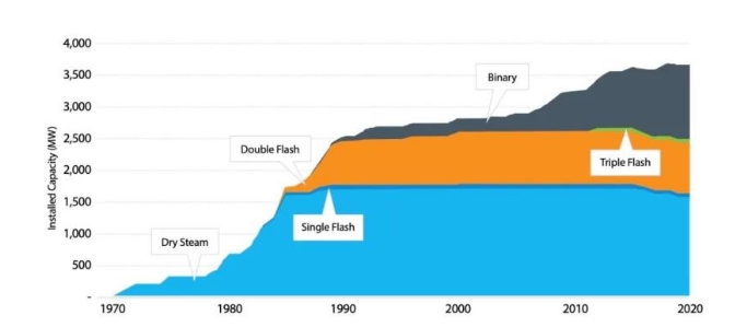 技術(shù)路線上,美國(guó)地?zé)岚l(fā)電以干蒸汽發(fā)電技術(shù)和閃蒸法(含單級(jí)閃蒸、雙級(jí)閃蒸和三級(jí)閃蒸)發(fā)電技術(shù)為主,自2000年至2020年以來(lái),美國(guó)新增地?zé)犭娬局?,幾乎均為雙級(jí)閃蒸法發(fā)電技術(shù)系統(tǒng),僅有一家為三級(jí)閃蒸系統(tǒng)。服役年限上,美國(guó)已經(jīng)有超過(guò)64%的地?zé)犭娬痉勰晗蕹^(guò)30年,在運(yùn)20-30年的地?zé)犭娬菊?%,在運(yùn)10-20年的地?zé)犭娬菊?3%,在運(yùn)小于10年的地?zé)犭娬菊?7%。地域分布上,加州和內(nèi)華達(dá)州擁有美國(guó)溫度最高的地?zé)豳Y源,因此這兩個(gè)州的地?zé)岚l(fā)電量占美國(guó)地?zé)岚l(fā)電量的90%以上,其余主要分布在阿拉斯加、夏威夷、愛(ài)達(dá)荷、新墨西哥州、俄勒岡和猶他州,加州共計(jì)有51座地?zé)犭娬?,總裝機(jī)容量2627MW,內(nèi)華達(dá)州共計(jì)有28座地?zé)犭娬?,總裝機(jī)容量797MW。價(jià)格成本上,地?zé)岚l(fā)電的成本在59美元/MWh到101美元/MWh之間,仍然高于燃機(jī)發(fā)電和風(fēng)電光伏的發(fā)電成本,美國(guó)的地?zé)岚l(fā)電成本預(yù)計(jì)到2050年將降至42美元-77美元/MWh之間。