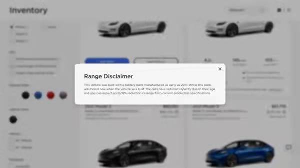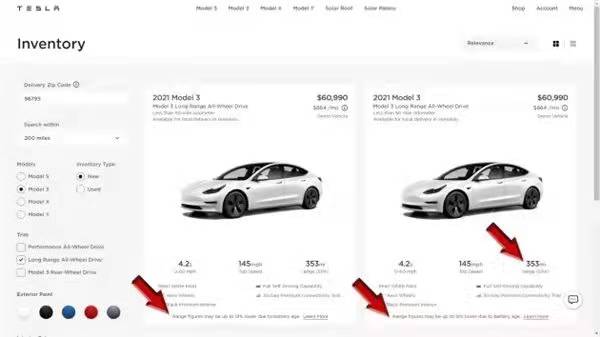 特斯拉將這些車作為新車銷售,但在購車頁面添加了一句小字警告,點(diǎn)開之后顯示:這款車使用了早在2017年就生產(chǎn)出來的電池組,雖然這款電池組件在出廠時(shí)還是全新的,但由于電池使用時(shí)間較長,電池容量有所下降,與目前的生產(chǎn)規(guī)格相比,續(xù)航里程可減少12%。