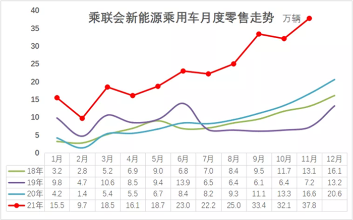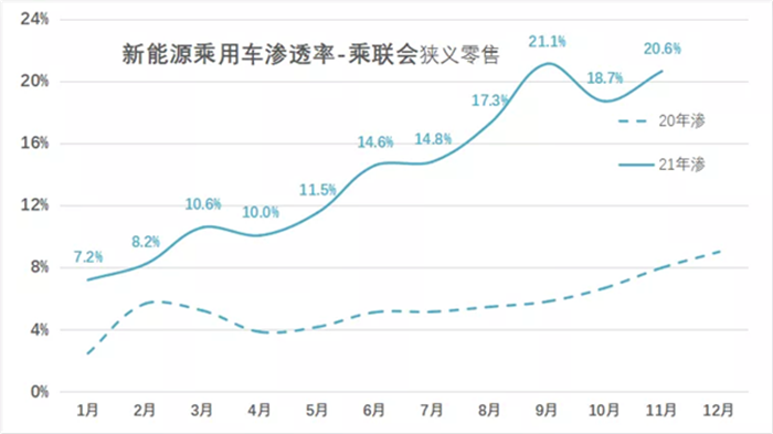 根據(jù)乘聯(lián)會(huì)數(shù)據(jù),今年11月,新能源乘用車零售銷量為37.8萬(wàn)輛,滲透率達(dá)到20.6%。1-11月的滲透率為13.9%,較2020年的5.8%提升8.1個(gè)百分點(diǎn)。