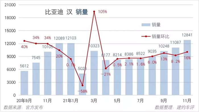 2020年11月,比亞迪漢成為中國(guó)品牌第一款售價(jià)在20-30萬(wàn)元區(qū)間、月銷過(guò)萬(wàn)的車型。