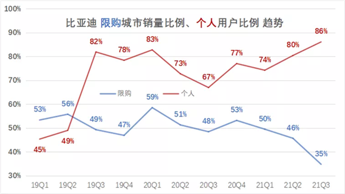 此外,DM-i省油、低價(jià)、沒(méi)有充電焦慮的優(yōu)勢(shì),適合中小城市,因此秦PLUS DM-i的上市還推動(dòng)了比亞迪在非限牌城市的滲透——從限購(gòu)城市銷售占比看,今年Q2之前,比亞迪一直處在50%左右的水平,銷量對(duì)限購(gòu)城市還有一定的依賴。今年Q3,隨著DM-i車型的銷量攀升,限購(gòu)城市占比快速下降到35%。