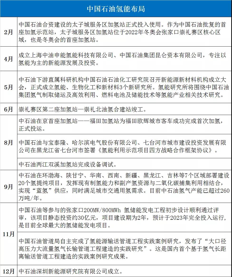 相比于中國(guó)石化,中國(guó)石油在氫能方面布局的動(dòng)作相對(duì)小些,但相比于去年同期,今年中國(guó)石油涉足的深度和廣度都有所增加(如下圖)。未來(lái),中國(guó)石油還將在全國(guó)范圍投運(yùn)50座加氫站。