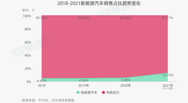 中汽協(xié)數(shù)據(jù),2021年1-11月中國汽車?yán)塾?jì)銷售2348.9萬輛,其中新能源汽車完成銷售299萬輛。