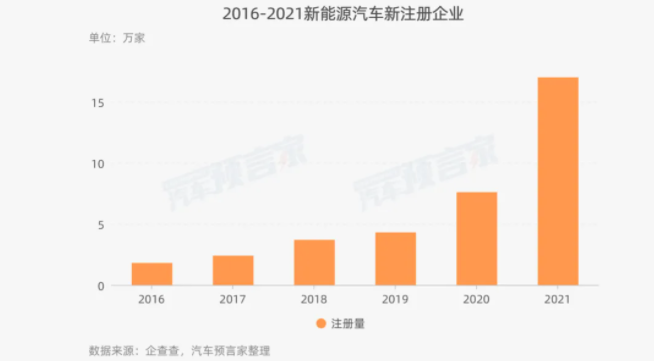 根據(jù)企查查網(wǎng)站數(shù)據(jù),近五年(2016-2020年),中國新能源汽車新注冊成立的數(shù)量分別是2016年(1.8萬家)、2017年(2.4萬家)、2018年(3.7萬家)、2019年(4.3萬家)、2020年(7.6萬家),2021年截止到11月份的注冊量是17.0萬家。