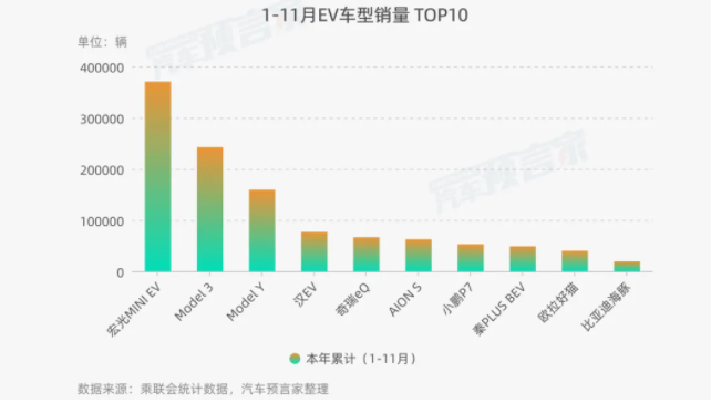 2021年1-11月中,共有三款純電動(dòng)車型累計(jì)銷量超過了10萬輛,分別為宏光MINI EV、Model 3和Model Y。