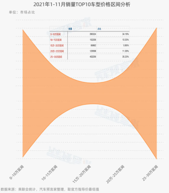 經(jīng)過對在售新能源車型TOP10價(jià)格梳理后我們發(fā)現(xiàn),當(dāng)前市場呈現(xiàn)啞鈴型結(jié)構(gòu)。0-10萬區(qū)間和25-30萬區(qū)間車型銷量在銷量TOP10車型中占比較高。而普通燃油車主力銷售區(qū)間15-20萬元區(qū)間占比較低。
