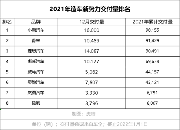 2022年1月1日,造車新勢力相繼公布2021年12月及全年累計銷量。在12月交付量方面,小鵬汽車以16,000輛的成績,繼續(xù)穩(wěn)坐冠軍位置。其次是理想汽車14,087輛和蔚來的10,489輛。