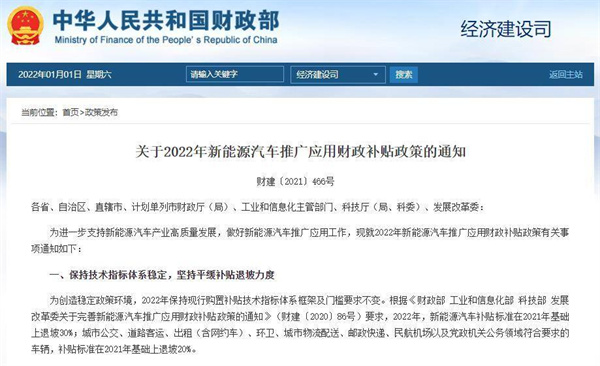2021年12月31日,財政部、工信部、科技部、發(fā)展改革委發(fā)布關(guān)于2022年新能源汽車推廣應(yīng)用財政補貼政策的通知:2022年,新能源汽車補貼標準在2021年基礎(chǔ)上退坡30%;城市公交、道路客運、出租(含網(wǎng)約車)、環(huán)衛(wèi)、城市物流配送、郵政快遞、民航機場以及黨政機關(guān)公務(wù)領(lǐng)域符合要求的車輛,補貼標準在2021年基礎(chǔ)上退坡20%。
