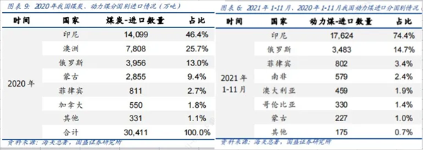 智通財經(jīng)APP了解到,印尼是世界第一大煤炭出口國,同時也是我國煤炭/動力煤第一大進口來源國。數(shù)據(jù)顯示,2020年我國累計進口煤炭3億噸,其中自印尼進口14099萬噸,占比46.4%。2021年1-11月,我國進口印尼動力煤1.77億噸,同比增長54.4%,占進口動力煤總量的74.4%。